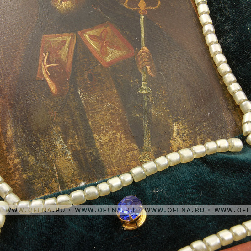 Представленная икона есть также икона паломническая, но выполненная на хорошем уровне и в среднем размерном формате (для недорогих паломнических деревянных образков она явно крупновата). Прежние владельцы берегли святой образ и поэтому решили его убрать в киот, но сделали они это не просто так, а с особой заботой и любовью: украсили икону своеобразным бархатным окладом, который вышили бисером и стразами.