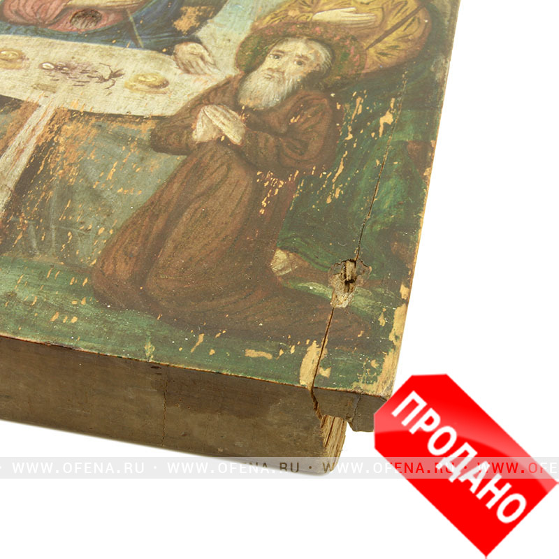 Гостеприимство Авраамово – образ не так часто встречающийся среди старинных икон, тут же Вашему вниманию предложена небольшая, но очень добрая икона, изготовленная настоящим мастером своего дела!
