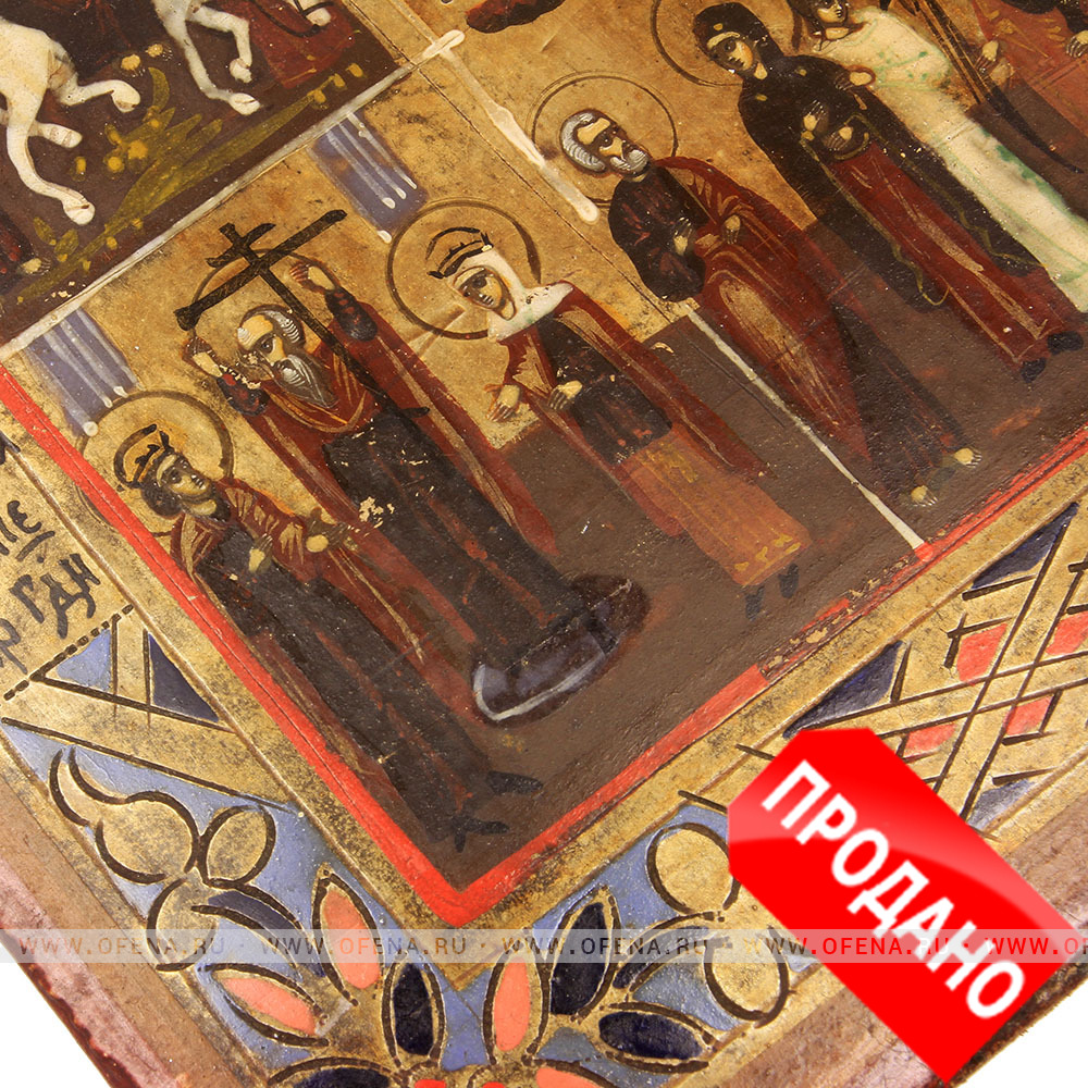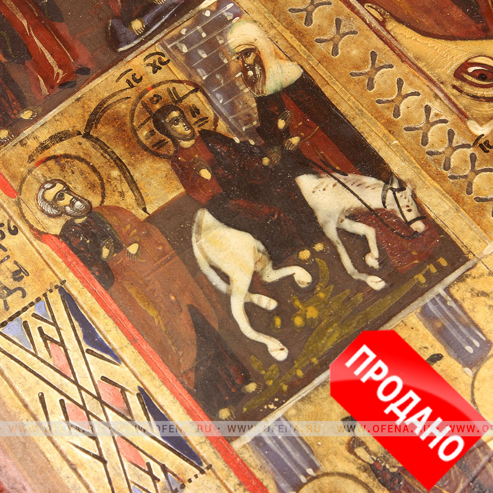 Антикварная икона 12 Праздников – целый миниатюрный домашний иконостас, ведь на небольшой иконной доске собраны в миниатюрных клеймах основные годовые Церковные Праздники, по сути на иконе даже не 12, а целых 14 икон!